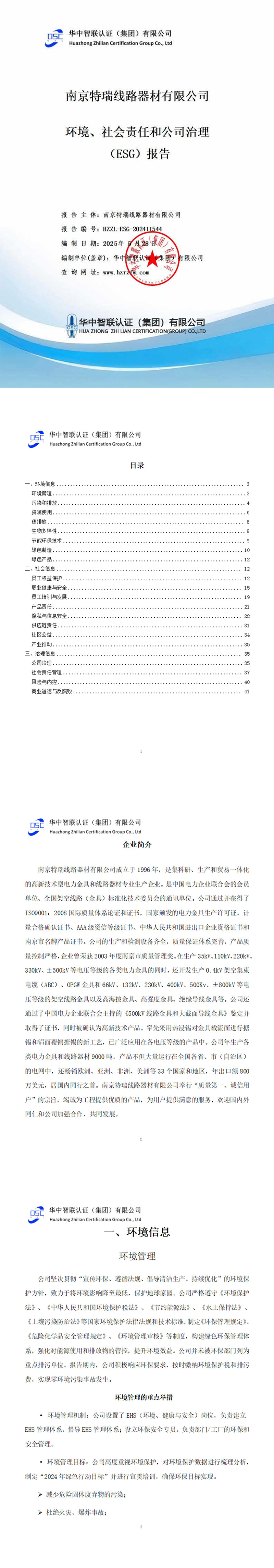 南京特瑞线路器材有限公司环境、社会责任和公司治理(ESG)报告